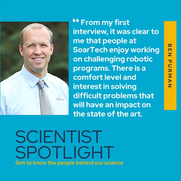 “From my first interview, it was clear to me that people at SoarTech enjoy working on challenging robotic programs,” Purman explained. “There is a comfort level and interest in solving difficult problems that will have an impact on the state of the art.”